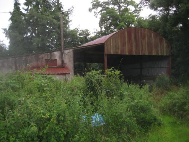 The barn. For scale, the little red awning on the left side of the building, by the electric pole, is about 7' high.