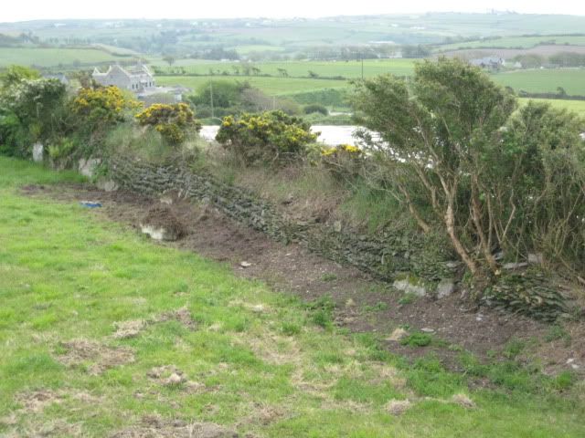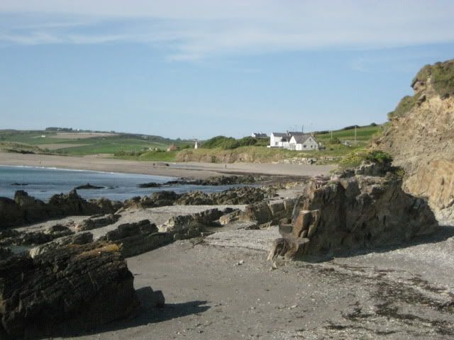 The twins had a birthday party to attend, and Mark didn’t want me to feel like I was working while he and Debbie weren’t, so they gave me the afternoon off. From 2:30 (after dinner) to around 7 I finally took an intense walking tour of the area. The vast, vast bulk of this hike was just going through/between/around farms and houses, but there were a handful of goals. Actually, come to think of it, each goal was a separate branch off a single “main” (not big at all) road. First I made my way to the second-closest and first-ranked pub in the area – just as a waypoint, not to get a pint at 3 in the afternoon – and beyond it to a small, rocky beach. I found a piece of coal and, of course, used it to write “P.G. ‘09” on a rock in an area that might not get rained on often. Then I went back to the main road and walked a ways up it further until I saw the sign saying “Galley Head – 3 km”. I turned up that and walked to the end and back, for Galley Head is the local lighthouse, said to be quite picturesque. I’ll talk more about the lighthouse in the next paragraph, because there’s quite a bit to talk about there. After seeing that and coming back to the main road, I kept on going to Red Strand, which is a fairly short but pretty local beach. There I met a curious couple – an Oregonian and an Irishwoman who live in Germany. At first, I just took a picture of them like they asked, but later they drove past me hiking back to the farm and gave me a lift. All in all though, I was walking a solid four hours. It was refreshing!