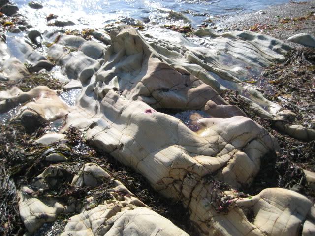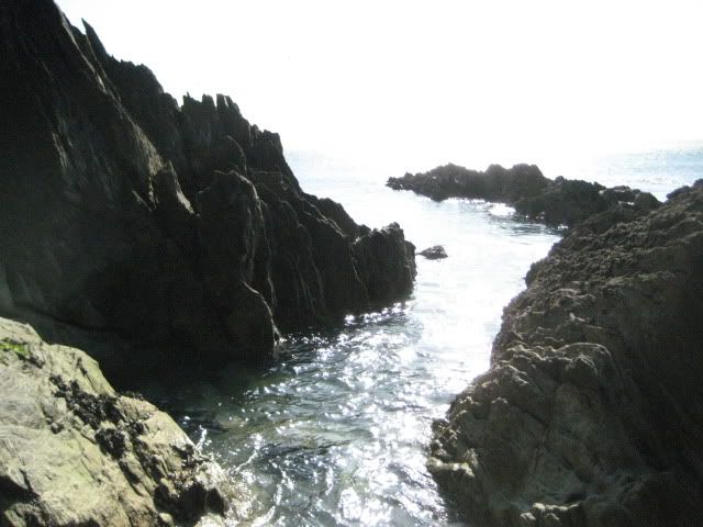 As I was taking a picture along the road to the lighthouse – I was probably four fifths of the way there – this beautiful yellow lab came bounding out of the nearest house and sat down next to me. There were no people visible in or around the house, so I pet him and he turned out to be quite friendly. Then, as I continued walking to the end of the peninsula, he continued to accompany me. Sometimes he was at my side, sometimes he jumped up on the low stone wall separating road from cliff, sometimes he ran a few yards ahead. The lighthouse itself is private property, but there was a little grassy clearing at the end of the public road, and you could go down a relatively safe portion of the cliff. When we reached the clearing, he happily jumped around and sniffed around the edge of the cliff. It was…shockingly nice to have him there. Having a companion – even (especially?) one who didn’t talk, but was just always there at my side wagging his tail – was extremely reassuring.