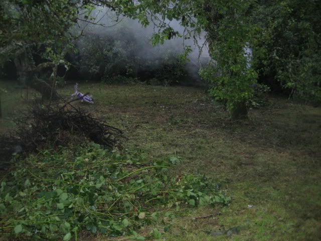 Cleared orchard and the fire burning the leftovers. All the "grass" you see used to be a nettle/bramble patch about five feet high.