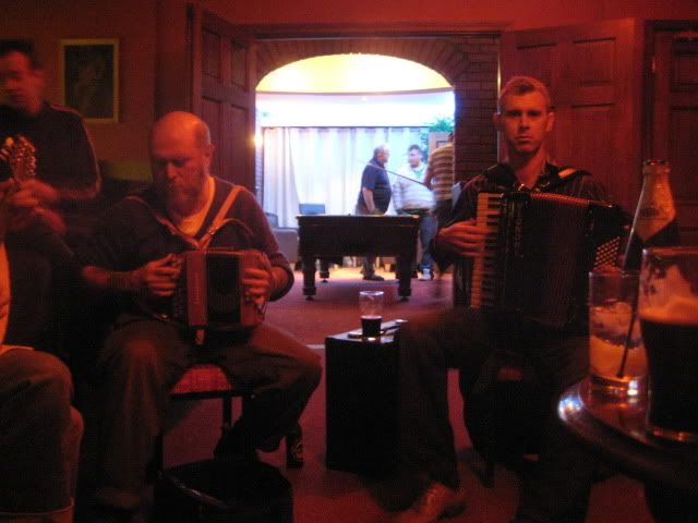 Last night I went out with Rebecca, Natalia, Willie, and Tim. We arrived at our pub early enough that we were able to get seats next to one of the sessions. However, we quickly discovered to our dismay that the session we’d chosen was one that only played one song every ten or fifteen minutes, spending the in-between time relaxing and drinking and chatting with one another. Ah well. One of the other sessions in the pub had two harpists, which was very cool, and I stood and watched them for a while.